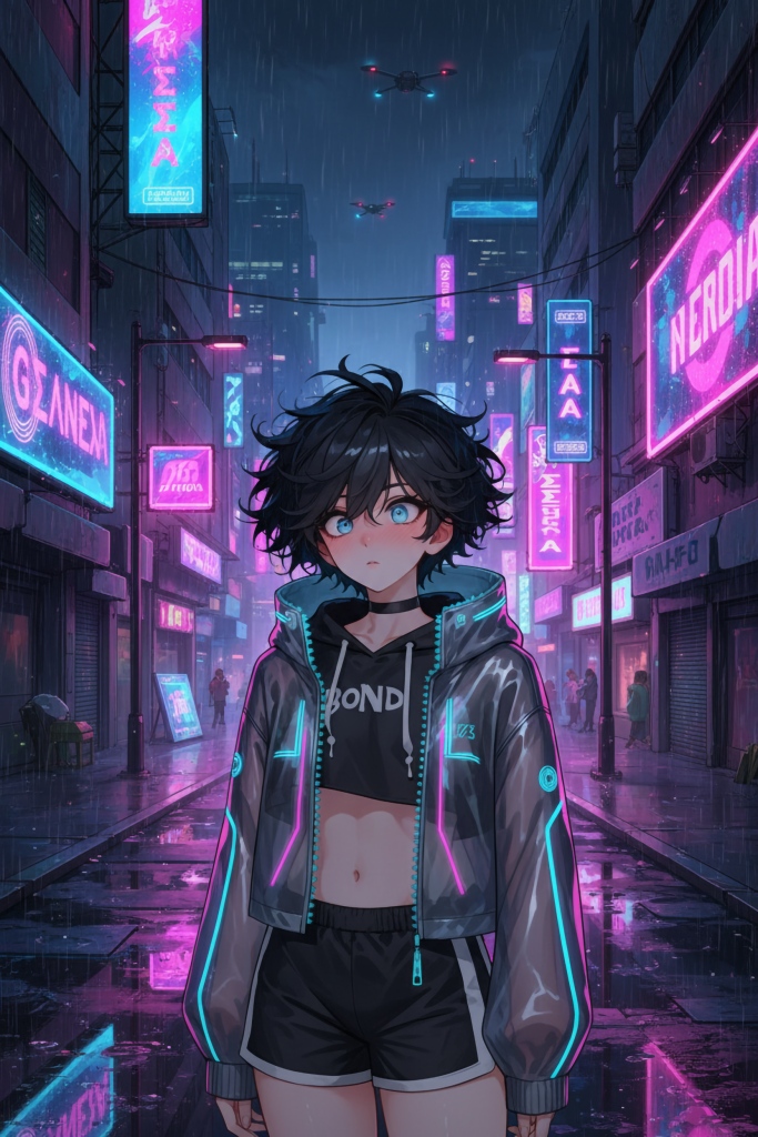 Kai stepped off the maglev train into the heart of it all, his heart pounding like the distant thunder of the city’s underbelly. At 18, he was a vision of delicate rebellion: petite frame, skin pale as moonlight, messy waves of dark black hair framing his face, and those large, discreet blue eyes that seemed to hold the ocean’s depths. He tugged at his choker, a subtle accessory that hinted at his true self, hidden under a loose jacket to avoid the scans. Fleeing the stifling conformity of his provincial hometown, where whispers of his “unnatural” beauty had turned to threats, Kai sought freedom in the chaos of the capital. But freedom, he would soon learn, came at a price.