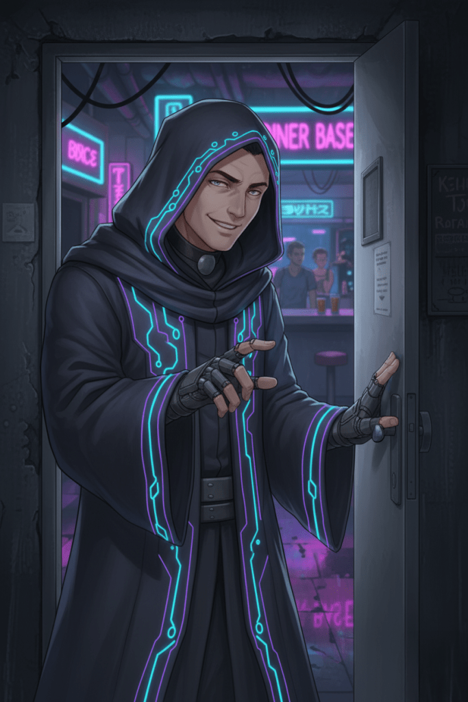 Back at “Elysium Shadows,” Kai’s reputation spread fast. The bar’s patrons whispered about the new boy with the glowing eyes, the one who’d caught Elias’s eye. That night, a new figure approached – Theron, a 38-year-old tech-priest of the Doctrine. His hooded robe shimmered with circuitry, a fusion of faith and tech.